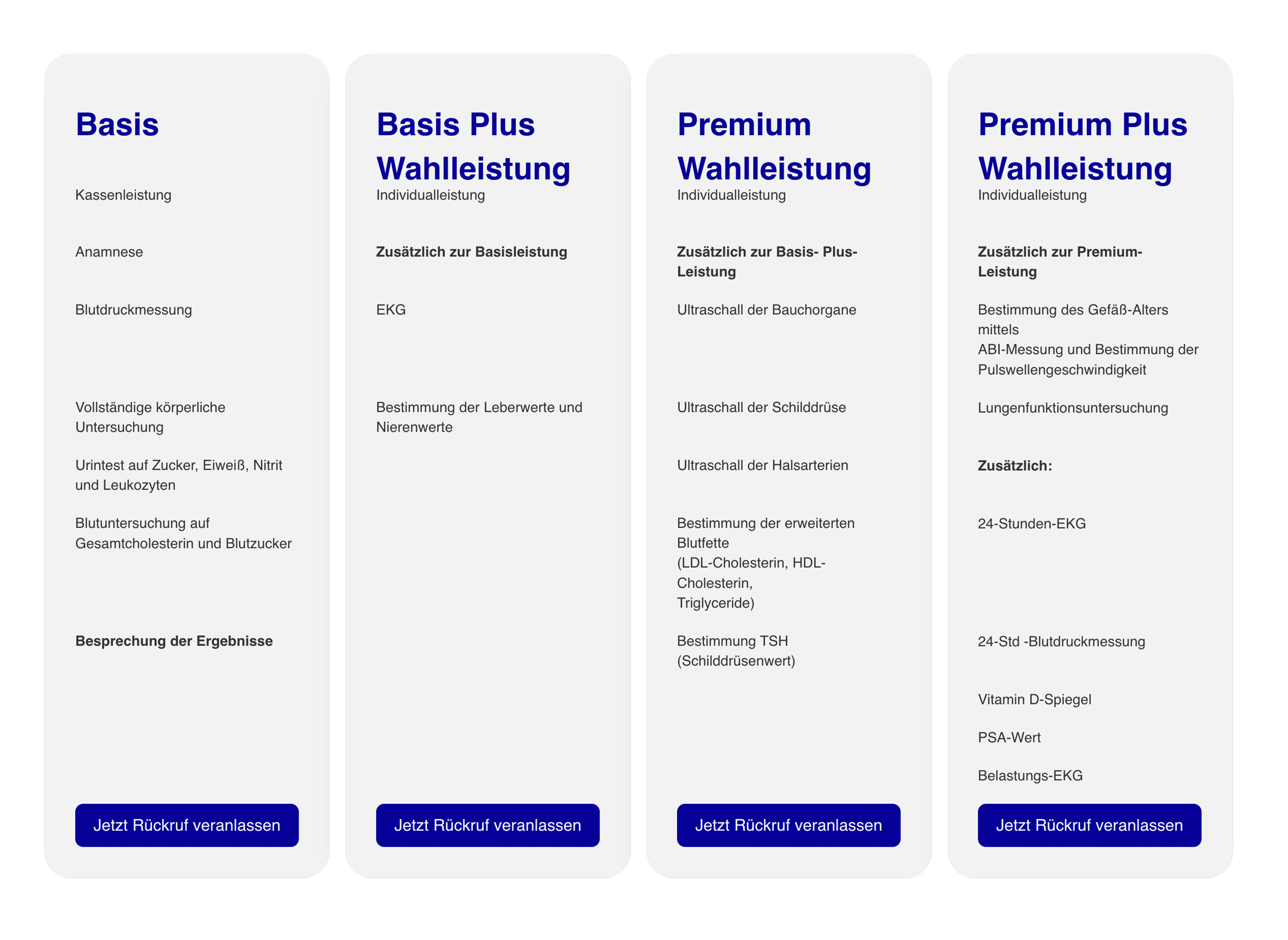 | Basisuntersuchung | Erweiterte Vorsorgeuntersuchung inkl. individueller Laborwerte, Mikronährstoffanalyse |